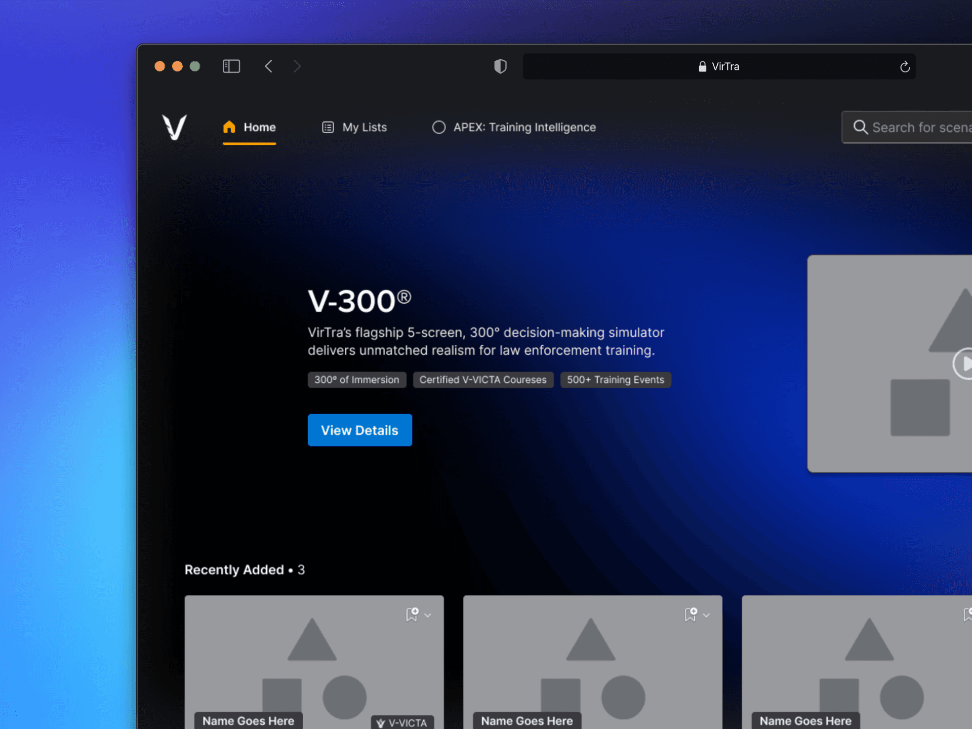 A core decision was to move beyond a search-only experience. VirTra often emphasizes that content is king and content is inherently visual. Inspired by how platforms like Netflix surface large libraries, the interface leaned into visual discovery supported by structured filters, rather than forcing users to rely on exact text queries.